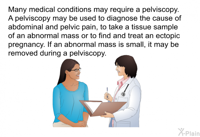 A pelviscopy may be used to diagnose or treat certain conditions that affect the pelvic organs. It allows a health care provider to see inside the abdomen and pelvis with medical scopes. If your health care provider recommends a pelviscopy for you, the decision whether or not to have this procedure is yours.