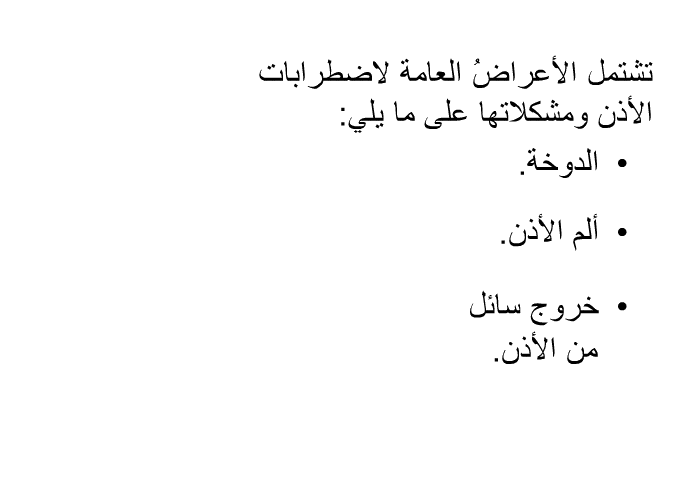 من الممكن أن تتباين أعراضُ اضطرابات الأذن ومشكلاتها تبايناً كبيراً، وذلك بحسب المشكلة. لكنَّ الأعراضَ الأكثر شيوعاً هي فقدان السمع، ومشكلات التوازن.