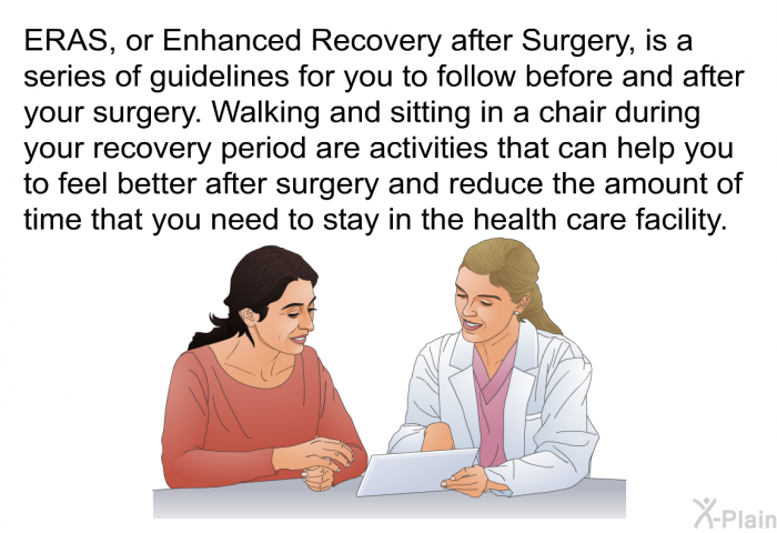 ERAS, or Enhanced Recovery after Surgery, is a series of guidelines for you to follow before and after your surgery. Walking and sitting in a chair during your recovery period are activities that can help you to feel better after surgery and reduce the amount of time that you need to stay in the health care facility.