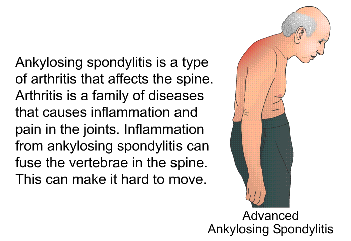 Ankylosing spondylitis is a type of arthritis that affects the spine. Arthritis is a family of diseases that causes inflammation and pain in the joints. Inflammation from ankylosing spondylitis can fuse the vertebrae in the spine. This can make it hard to move.