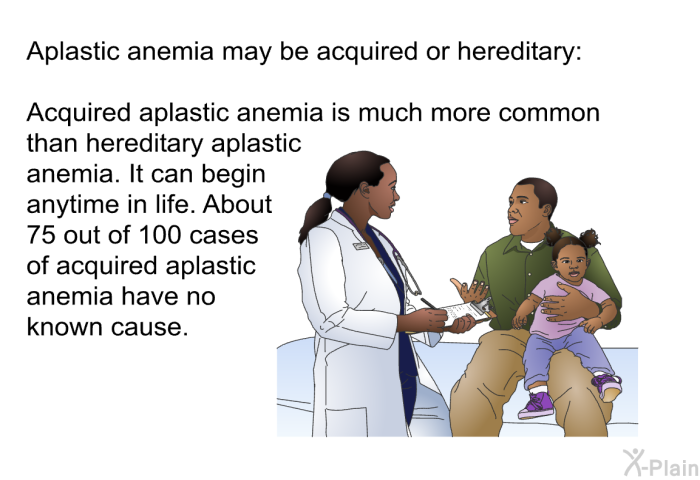 Aplastic anemia may be acquired or hereditary: Acquired aplastic anemia is much more common than hereditary aplastic anemia. It can begin anytime in life. About 75 out of 100 cases of acquired aplastic anemia have no known cause.