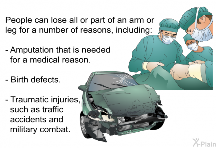 People can lose all or part of an arm or leg for a number of reasons, including:  Amputation that is needed for a medical reason. Birth defects. Traumatic injuries, such as traffic accidents and military combat.