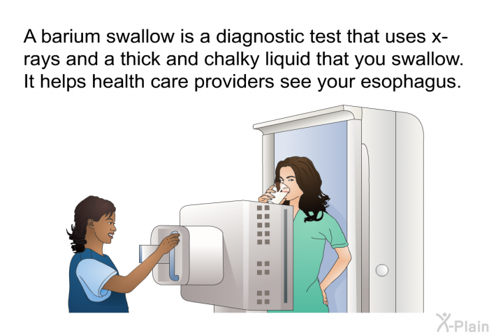 A barium swallow is a diagnostic test that uses x-rays and a thick and chalky liquid that you swallow. It helps health care providers see your esophagus.