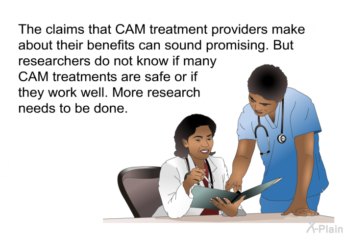 The claims that CAM treatment providers make about their benefits can sound promising. But researchers do not know if many CAM treatments are safe or if they work well. More research needs to be done.