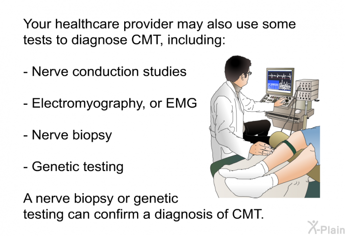 During the physical exam, your healthcare provider will look for signs of CMT, such as:  Muscle weakness in the legs, feet, arms, or hands Physical changes in the feet, such as high arches or hammer toes Reduced feeling in the feet or hands Slow reflexes