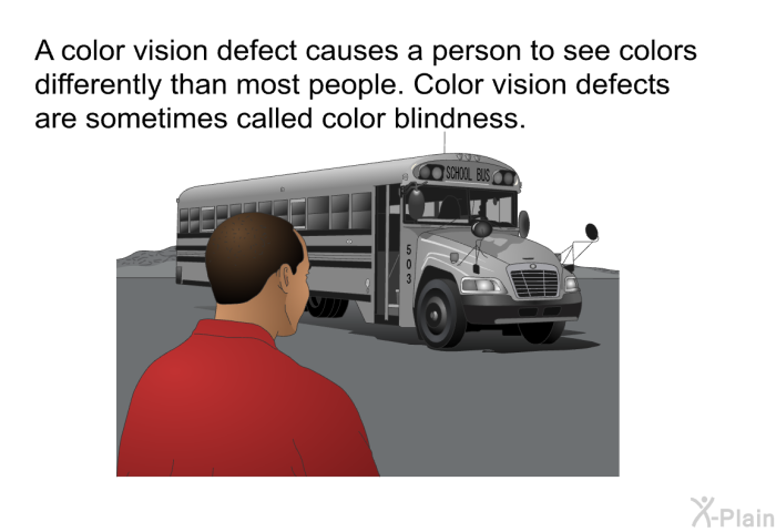 A color vision defect causes a person to see colors differently than most people. Color vision defects are sometimes called color blindness.