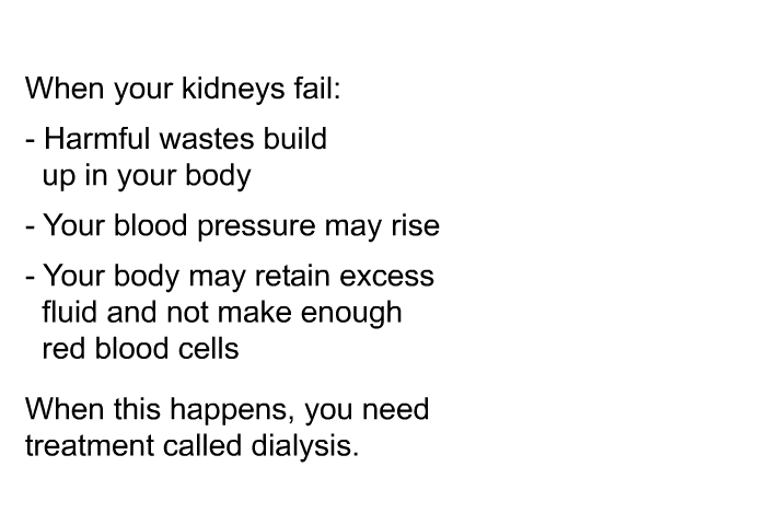 When your kidneys fail:  Harmful wastes build up in your body Your blood pressure may rise Your body may retain excess fluid and not make enough red blood cells When this happens, you need treatment called dialysis.
