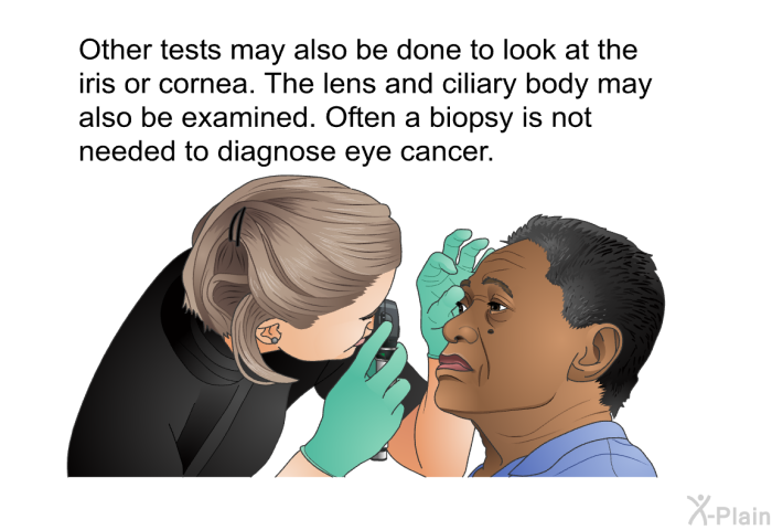 A fluorescein angiography can also diagnose eye cancer. It looks at blood vessels and the flow of blood in the eye. A dye called fluorescein is injected into a blood vessel in the arm. The dye travels through blood vessels in the eye. A special camera looks for any blockages or leaks.