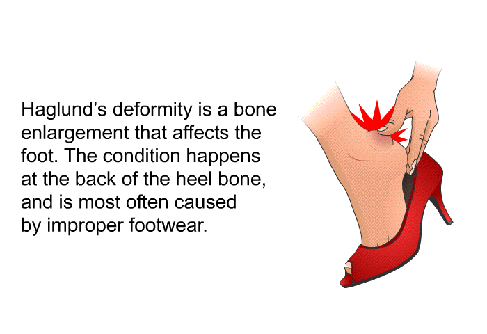 Haglund's deformity is a bone enlargement that affects the foot. The condition happens at the back of the heel bone, and is most often caused by improper footwear.