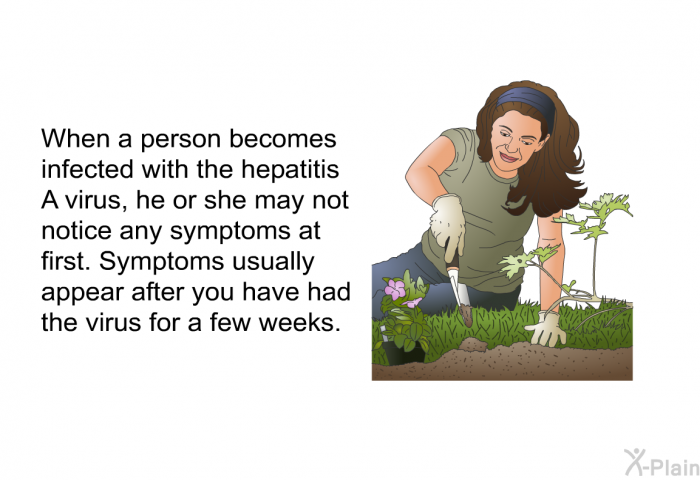 When a person becomes infected with the hepatitis A virus, he or she may not notice any symptoms at first. Symptoms usually appear after you have had the virus for a few weeks.