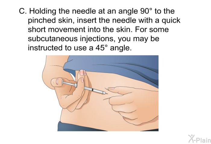 Insert Needle.  <OL TYPE=A> With one hand, pinch the skin by pulling the skin toward you. With the other hand, hold the syringe between your index finger and thumb, then steadying it with the second finger as you would a pencil.