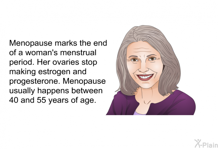Menopause marks the end of a woman's menstrual period. Her ovaries stop making estrogen and progesterone. Menopause usually happens between 40 and 55 years of age.