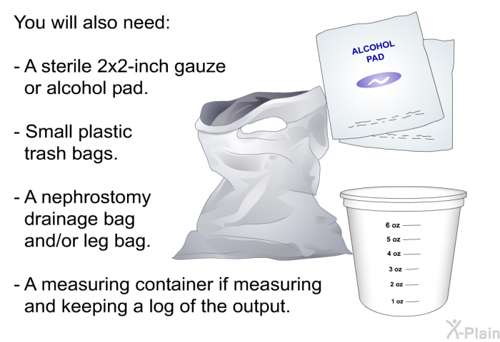 You will need the following supplies:  A clean washcloth, liquid soap and water or a moist towelette. A clean towel. The gauze dressing or transparent dressing. Tape.
