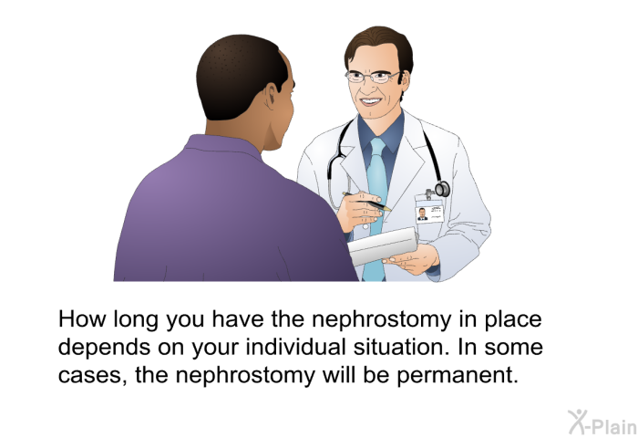 The catheter carries urine from your kidney into a bag outside the body. You may find that you still pass some urine through the bladder and urethra after a nephrostomy in one or both kidneys.