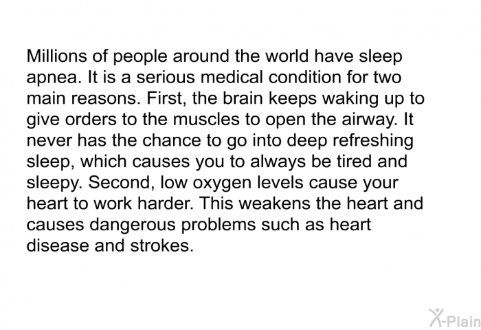 The amount of oxygen in your blood drops when your lungs can't get enough air. The brain automatically wakes you up and normal breathing starts again, often with a loud snort or a choking sound.