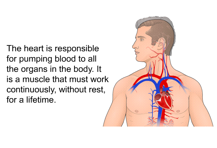 The heart is responsible for pumping blood to all the organs in the body. It is a muscle that must work continuously, without rest, for a lifetime.