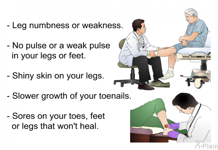 Other symptoms of PAD include:  A change in the color of your legs. Coldness in your lower leg or foot. Erectile dysfunction in men. Hair loss or slower hair growth on your feet and legs.