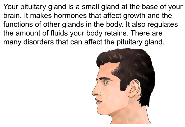 Your pituitary gland is a small gland at the base of your brain. It makes hormones that affect growth and the functions of other glands in the body. It also regulates the amount of fluids your body retains. There are many disorders that can affect the pituitary gland.