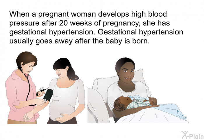 When a pregnant woman develops high blood pressure after 20 weeks of pregnancy, she has gestational hypertension. Gestational hypertension usually goes away after the baby is born.