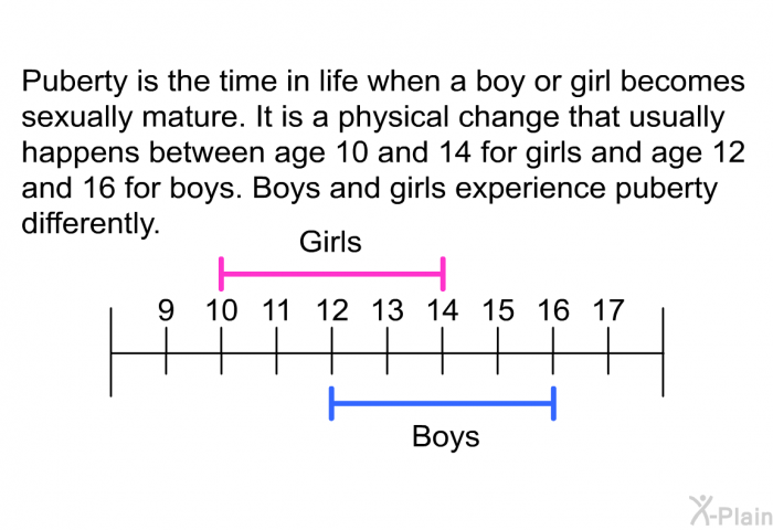 Puberty is the time in life when a boy or girl becomes sexually mature. It is a physical change that usually happens between age 10 and 14 for girls and age 12 and 16 for boys. Boys and girls experience puberty differently.
