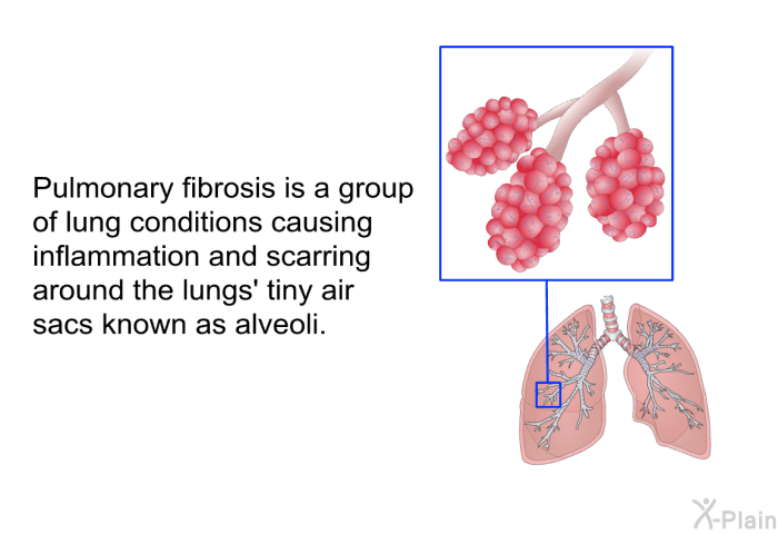 Pulmonary fibrosis is a group of lung conditions causing inflammation and scarring around the lungs' tiny air sacs known as alveoli.