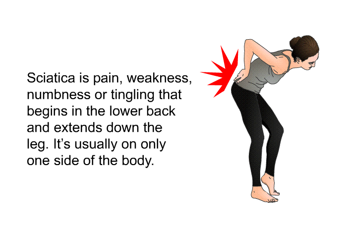 Sciatica is pain, weakness, numbness or tingling that begins in the lower back and extends down the leg. It's usually on only one side of the body.