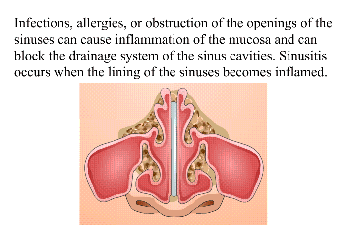 Infections, allergies, or obstruction of the openings of the sinuses can cause inflammation of the mucosa and can block the drainage system of the sinus cavities. Sinusitis occurs when the lining of the sinuses becomes inflamed.