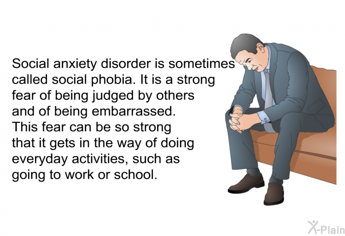 Social anxiety disorder is sometimes called social phobia. It is a strong fear of being judged by others and of being embarrassed. This fear can be so strong that it gets in the way of doing everyday activities, such as going to work or school.
