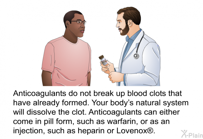 Anticoagulants, sometimes called blood thinners, lower your blood's ability to clot. They are used to stop clots from getting bigger and to prevent a blood clot from forming.