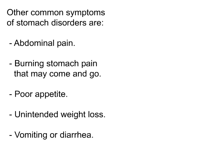 Symptoms of stomach disorders can vary widely and depend on the problem. The most common symptoms of a stomach disorder are heartburn and nausea.