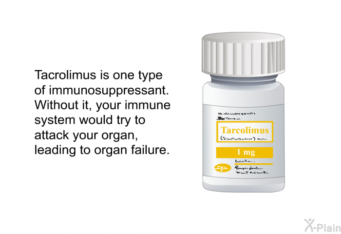 Tacrolimus is one type of immunosuppressant. Without it, your immune system would try to attack your organ, leading to organ failure.