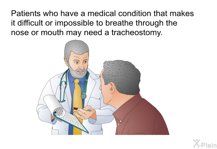 Patients who have a medical condition that makes it difficult or impossible to breathe through the nose or mouth may need a tracheostomy.