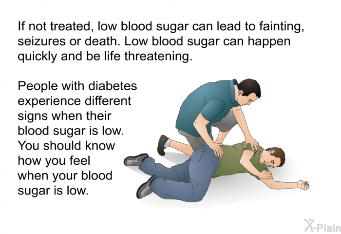 Signs of low blood sugar, or hypoglycemia, include:  Sweating, shaking, nervousness, and a pounding heart. Hunger. Dizziness or faintness. Personality changes, confused thinking, impatience, or crankiness. Numbness of the lips and tongue. Headache. Blurred vision. Slurred or slowed speech.
