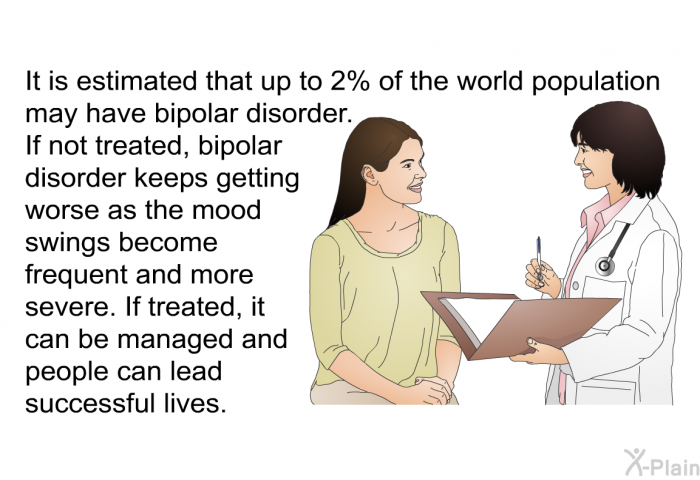 It is estimated that up to 2% of the world population may have bipolar disorder. If not treated, bipolar disorder keeps getting worse as the mood swings become frequent and more severe. If treated, it can be managed and people can lead successful lives.