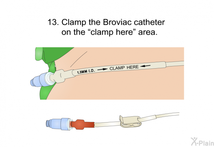 <OL START=12> Open the clamp on the Broviac catheter and flush the catheter. Remove the syringe and discard it in an appropriate container.