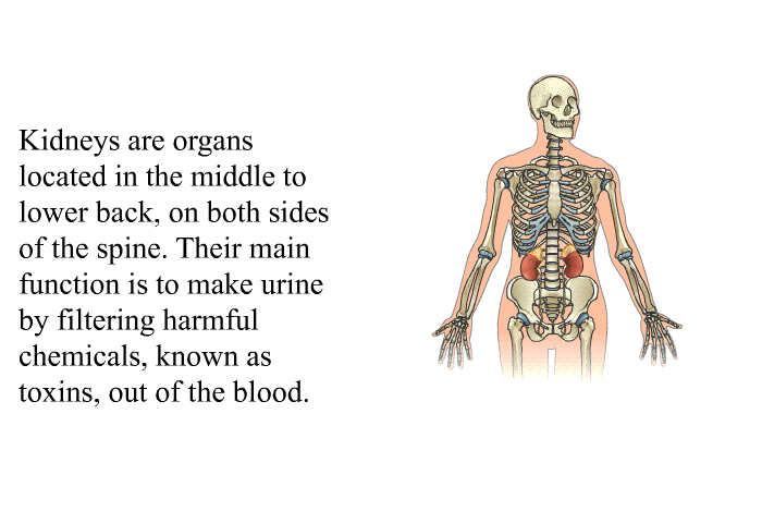 Kidneys are organs located in the middle to lower back, on both sides of the spine. Their main function is to make urine by filtering harmful chemicals, known as toxins, out of the blood.
