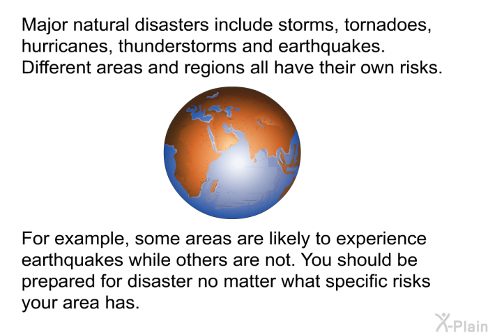 Not all areas are equally prone to earthquakes, hurricanes or tornadoes. It is important to learn which disasters are likely to threaten your community. It is also important to learn how your community prepares and responds to disasters.
