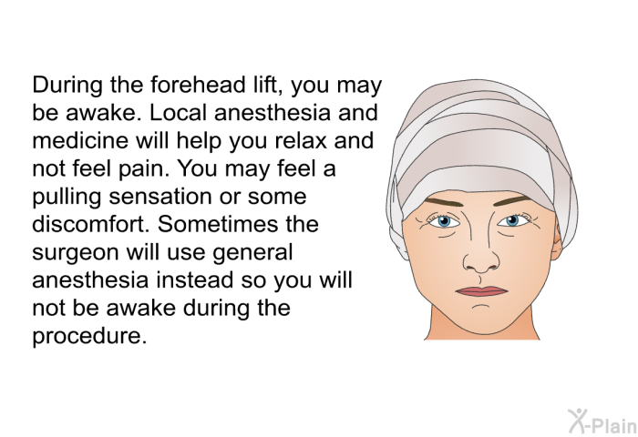 Three surgical procedures can be used for a forehead lift:  Coronal brow lift. Hairline brow lift. Endoscopic brow lift.