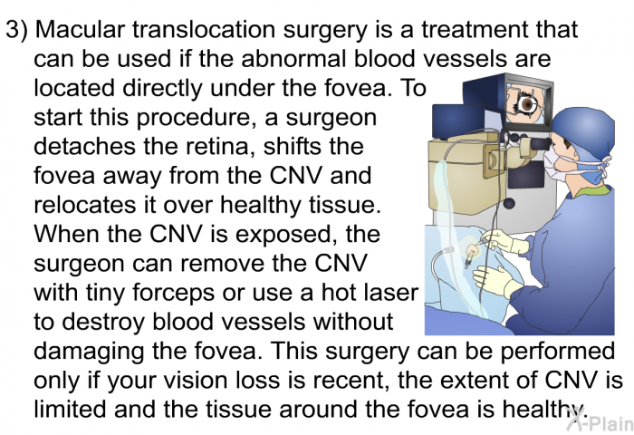 Macugen  injection into the eye. Macugen is a medication that causes new blood vessel leakage to dry up in some patients with wet AMD. Macugen must be injected directly inside the eye with a small needle every six weeks for up to two years. There is a small risk of eye infection and retinal detachment with injection into the eye, so patients receiving this treatment require close monitoring. You should discuss this treatment with your doctor.