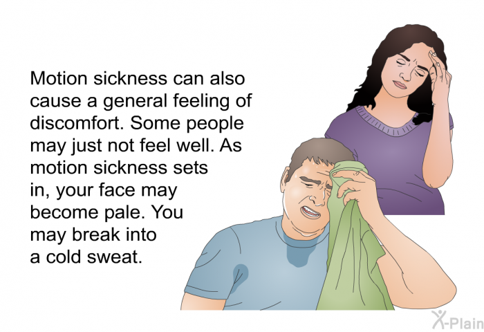 Other common symptoms of motion sickness include:  Abdominal pain. Dizziness, also called vertigo. Feeling very tired.