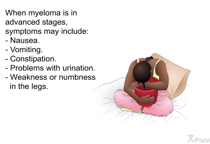When symptoms of multiple myeloma happen, they may include:  Bone pain, often in the back or ribs. Broken bones. Weakness and fatigue. Weight loss. Repeated infections.