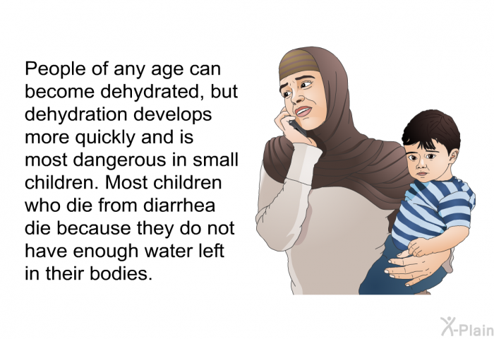 If a person's body loses more liquid than it takes in, she or he will become dehydrated. Dehydration means not having enough water left in your body. This can happen with severe diarrhea. It can also happen in very serious illnesses, when a person is vomiting or is too sick to take much food or liquid.