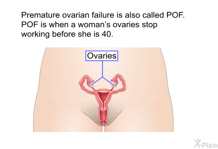 Premature ovarian failure is also called POF. POF is when a woman's ovaries stop working before she is 40.