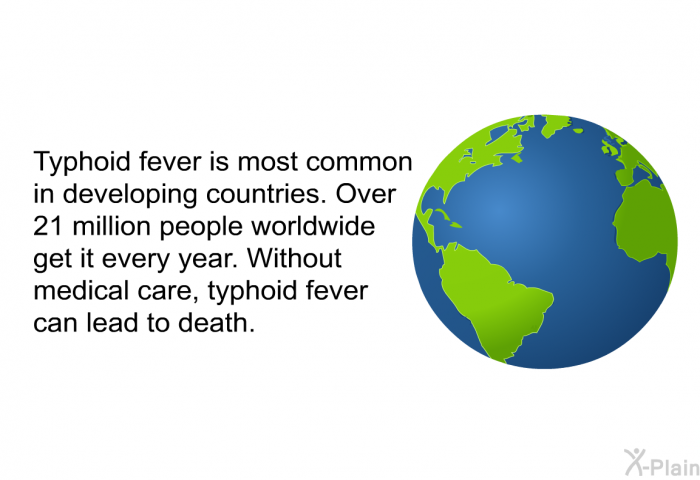 Typhoid fever is most common in developing countries. Over 21 million people worldwide get it every year. Without medical care, typhoid fever can lead to death.