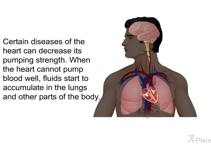Certain diseases of the heart can decrease its pumping strength. When the heart cannot pump blood well, fluids start to accumulate in the lungs and other parts of the body.