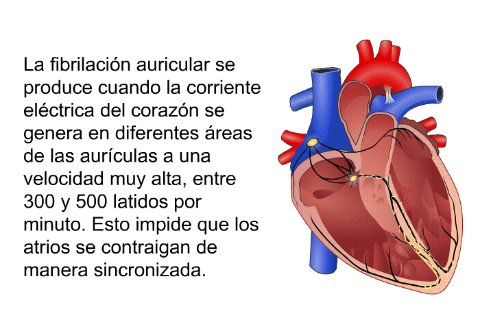La fibrilación auricular se produce cuando la corriente eléctrica del corazón se genera en diferentes áreas de las aurículas a una velocidad muy alta, entre 300 y 500 latidos por minuto. Esto impide que los atrios se contraigan de manera sincronizada.
