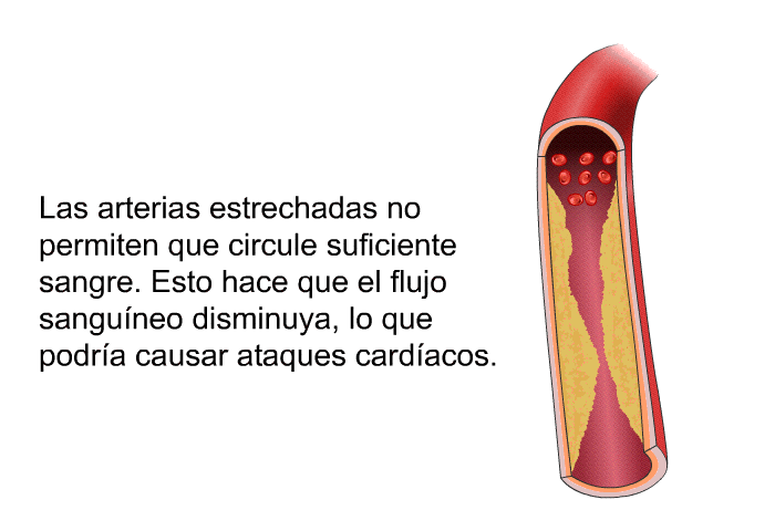 Los depósitos de calcio y el colesterol pueden acumularse en las arterias coronarias y formar una  placa' que estrecha la arteria. Los coágulos de sangre también pueden estrechar o bloquear las arterias.