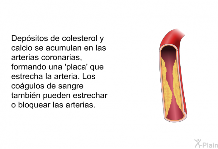 Depósitos de colesterol y calcio se acumulan en las arterias coronarias, formando una 'placa' que estrecha la arteria. Los coágulos de sangre también pueden estrechar o bloquear las arterias.