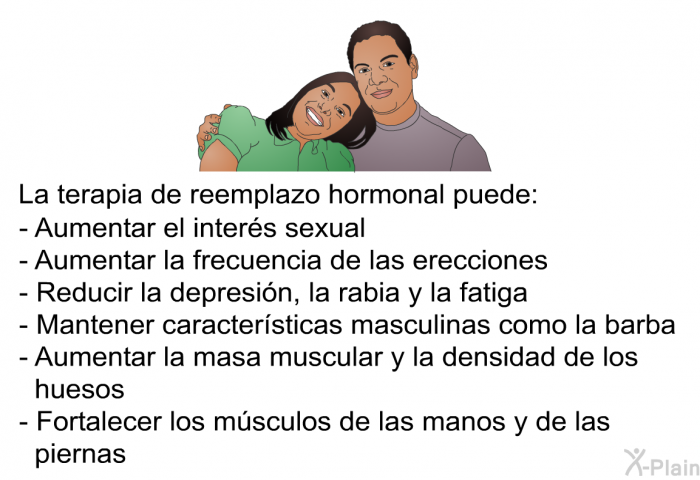 La terapia de reemplazo hormonal le provee al cuerpo más testosterona para reemplazar la que ha perdido. Este tipo de terapia puede eliminar muchos síntomas producidos por niveles de testosterona bajos.