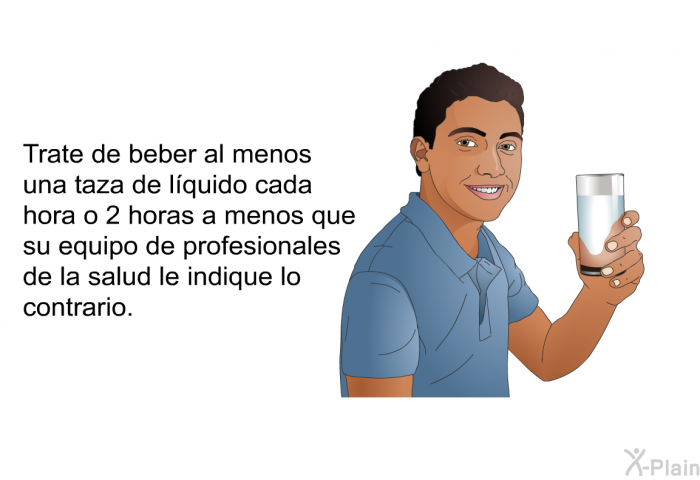 Asegúrese de beber abundante agua. Su cuerpo debe eliminar 2 cuartos/litros (8 tazas) de orina cada día. Esto significa que debe beber entre 2,5 y 3 cuartos (entre 10 y 12 tazas) de líquido cada día.